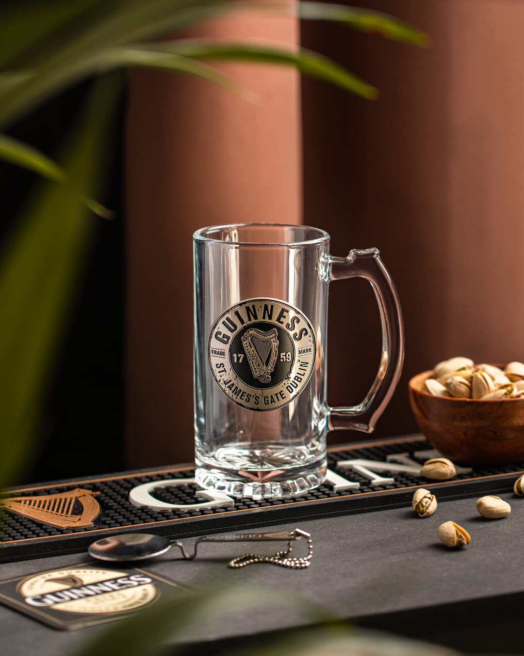 - DRINK THE GUINNESS WAY | This Guinness Label Tankard With Pewter Logo is the perfect glass for Guinness lovers everywhere. Made from thick quality Tall glass, this the original Guinness St. James Gate logo, this large glass beer mug is an excellent addition to any cabinet, bar, pub or kitchen.