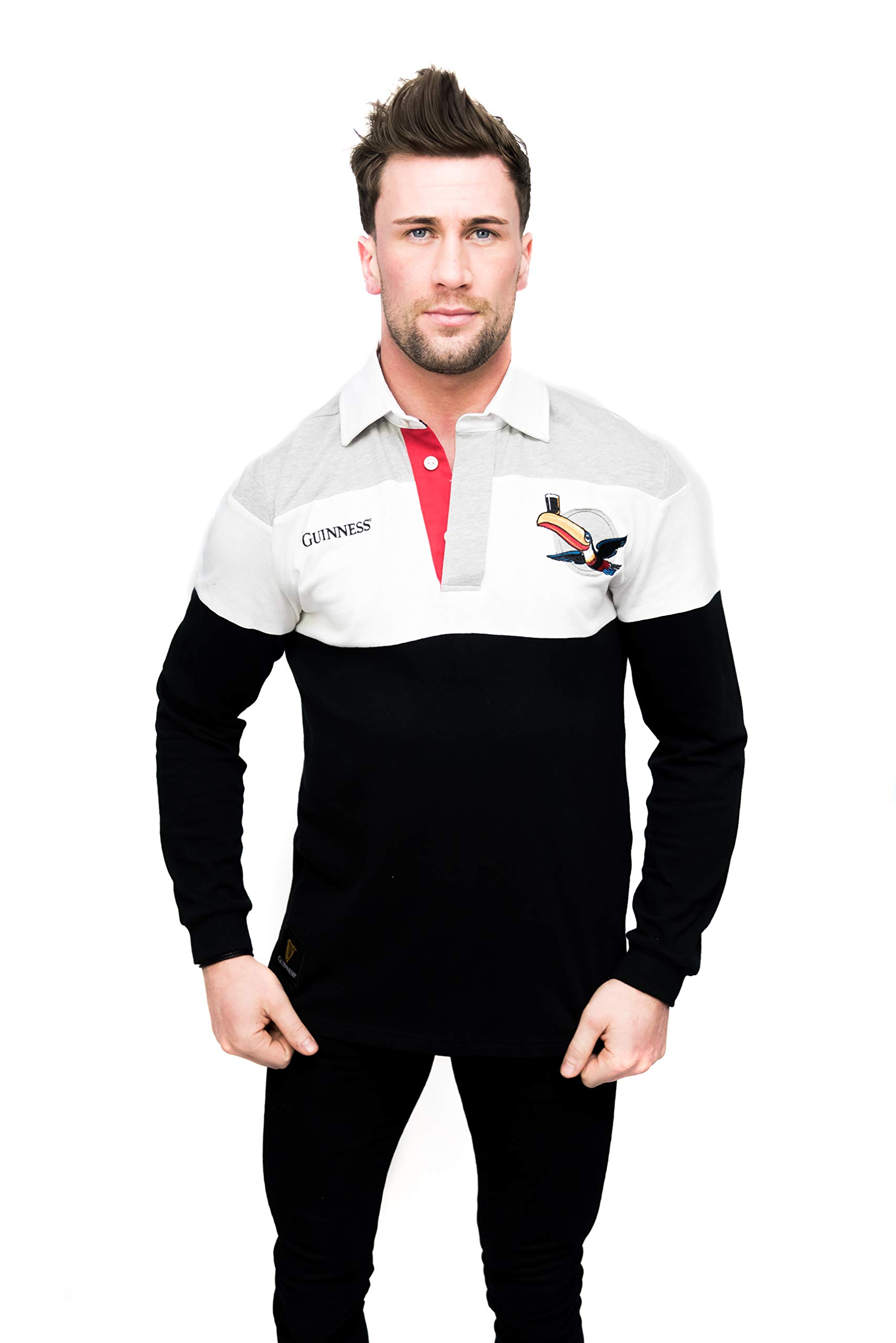 - STYLE FIRST | There is almost nothing more Guinness than the traditional rugby jersey with a patch on the arm and chest, and the authentic Guinness logo on the front. This jersey is black with a cream strip across the chest in a traditional two panel jersey style.